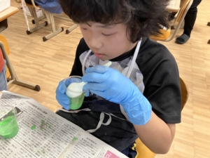 作ったスライムに①塩、②レモン汁、③酢を混ぜて、どのように変化するのか、何もしていないスライムとの感触の違いについて調べました。