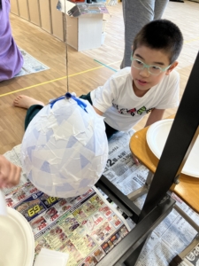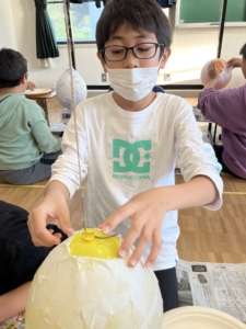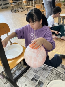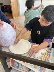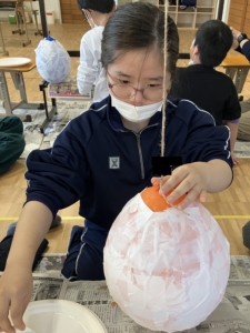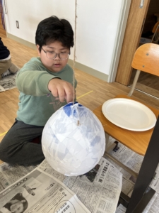 前回の続きの作業で、風船に半紙を貼っていく作業を行いました。