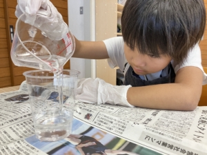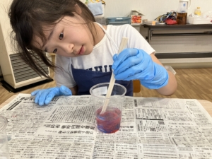 まずは、水、洗濯のり、ホウ砂、絵の具を計量して混ぜ合わせ、スライムを作ります。