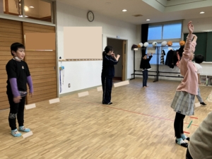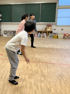 職員が「飛べ」「飛んで」「ジャンプ」いずれかの言葉を言ったら、1歩前にジャンプします。