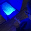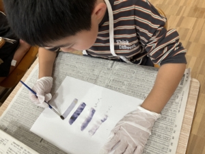 (うがい薬を紙に書くと紙のでんぷんに反応し、うがい薬が茶色から青紫色に変化します)