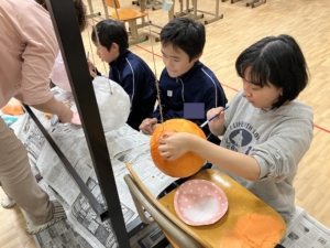 前回の続きで、オレンジ色のお花紙を貼る作業を行いました🎃