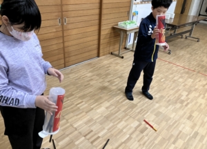 トイレットペーパーの芯やペットボトルなど色々なピンを倒して