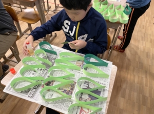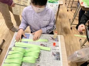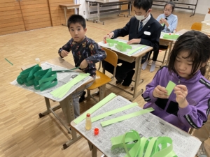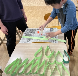 初回の今回は細長い画用紙を輪っかの形にする作業を行いました。(これがツリーの葉っぱの部分になります。)
