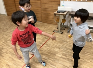 お友達とジャンケンをして勝ったらコインをもらい、負けたら自分のコインを相手に渡します。