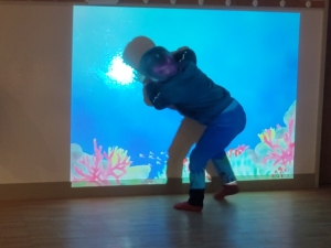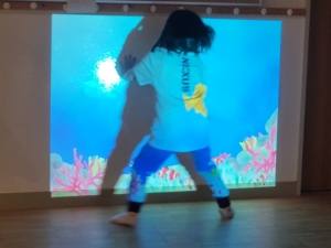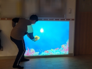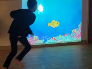 壁に映し出された魚を、1分以内にできるだけ多くタッチするというゲームです!