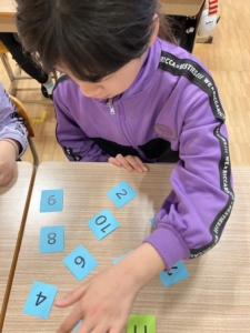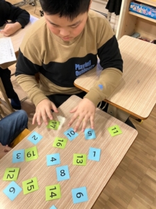 今回はランダムに配置されている1~50の数字を順番に目で追ったり、タッチしたりする活動をしました。