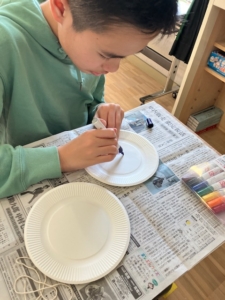 2枚の紙皿とおもり、たこ糸を使ってヨーヨーづくりをしました!