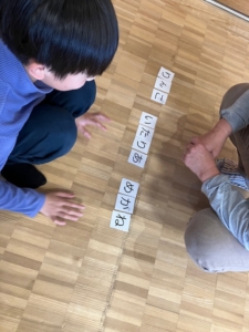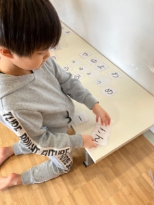 ゲームの前にまずはひらがなカードを50音順に並べて、ひらがな表を作りました。