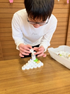 伝えた積み方だけではなく、自分なりに1番高く積める方法を考えて試し、