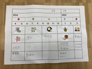 毎月の行事を表の中に貼りつけ、みんなで答え合わせしながら、