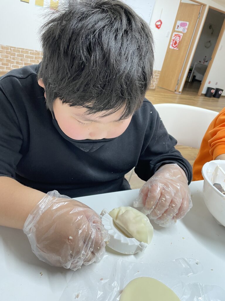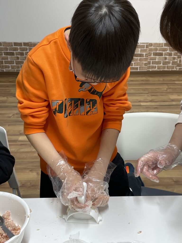 ひき肉と野菜をしっかりこねて、味付けしたら子どもたちが皮に詰めていきます💡