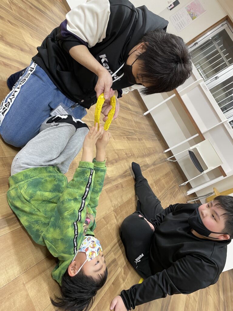 新1年生が買ってきてくれたおやつをみんなで食べてからは、今日の活動、『島から落ちるなゲーム』をしました。
