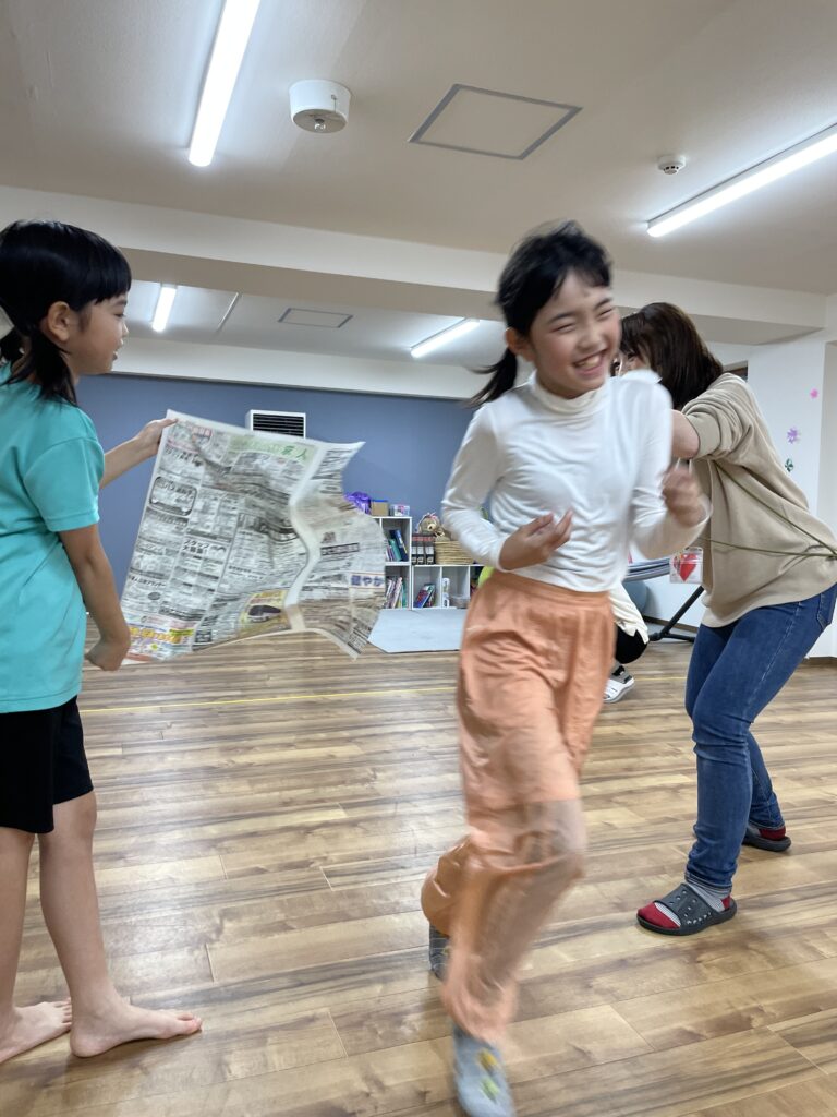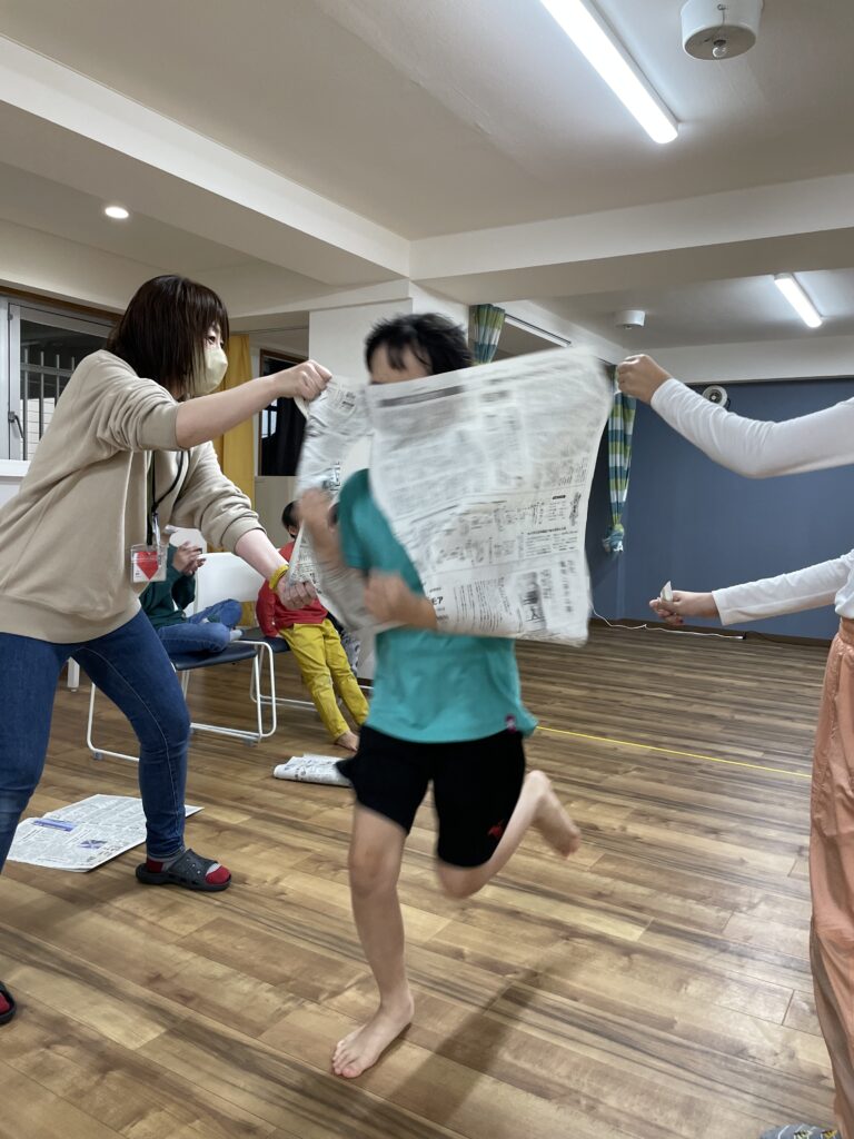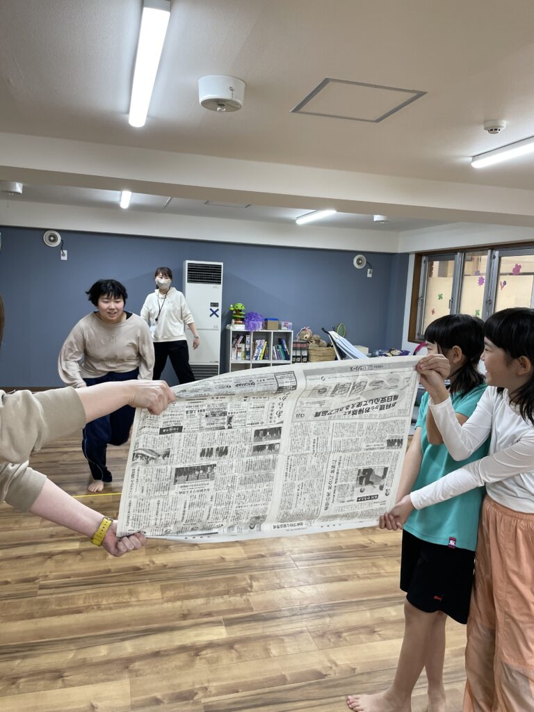 その後は、使った新聞紙をみんなでビリビリに破いたり、ぱぁ~と散らしたりして遊びました!