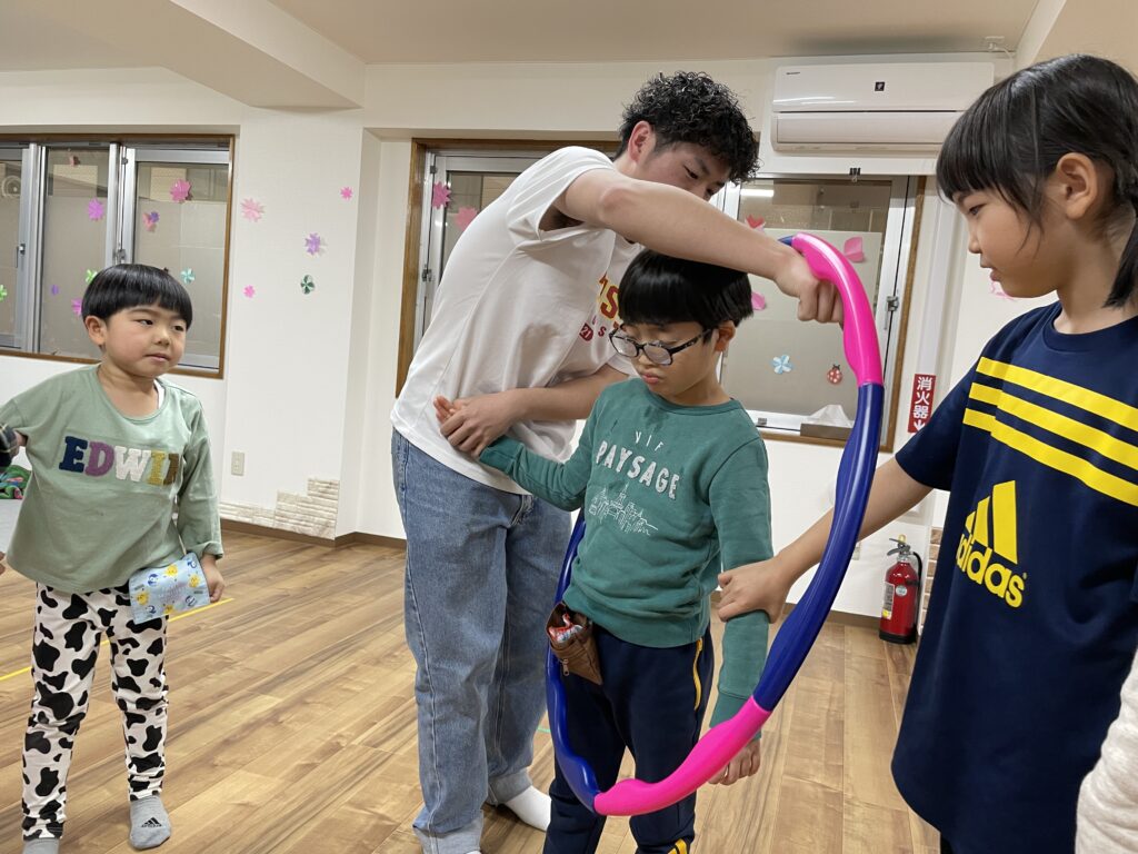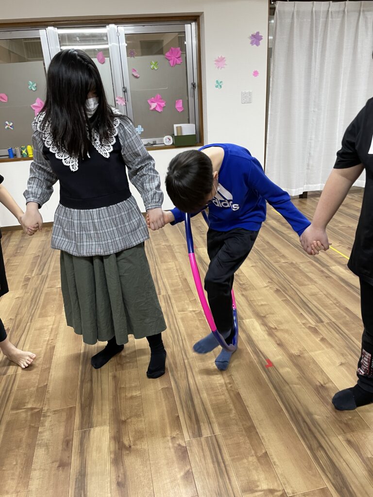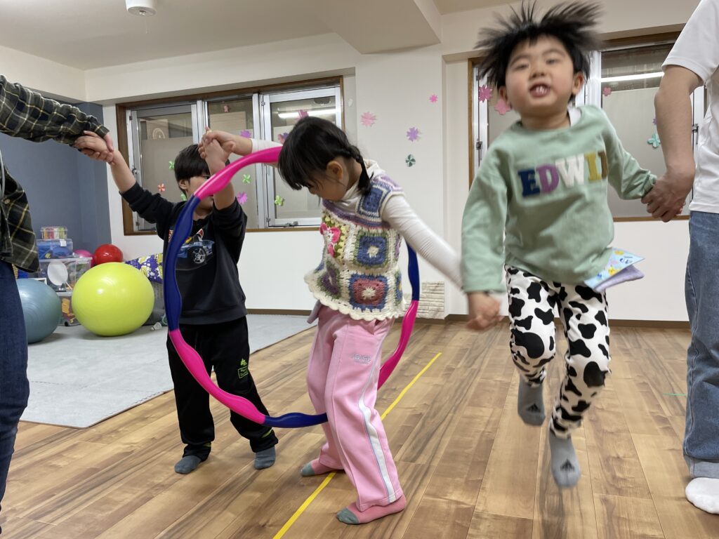 手を繋いでいるので、フラフープの順番が来たお友達だけでななく、
