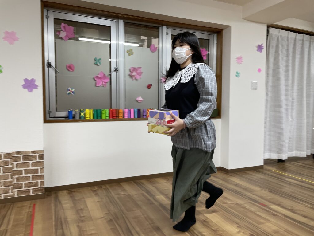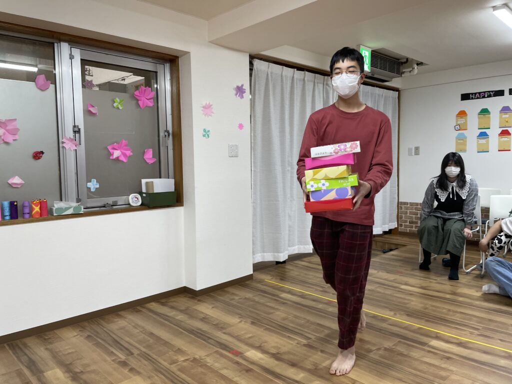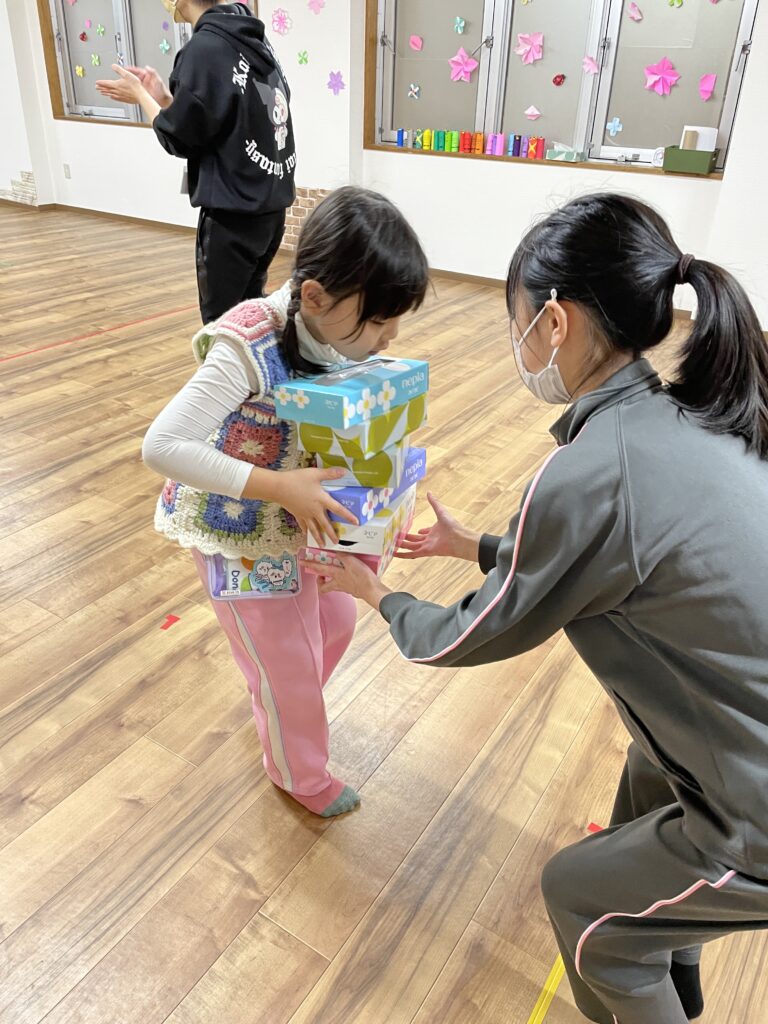 次の人にわたしていく度に、ティッシュ箱を1つずつ増やしていき、最後の人は6個を落とさずに運びました!