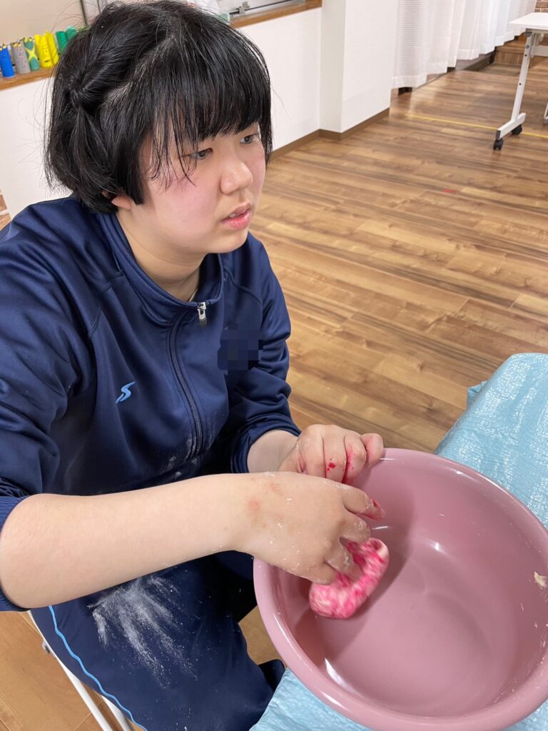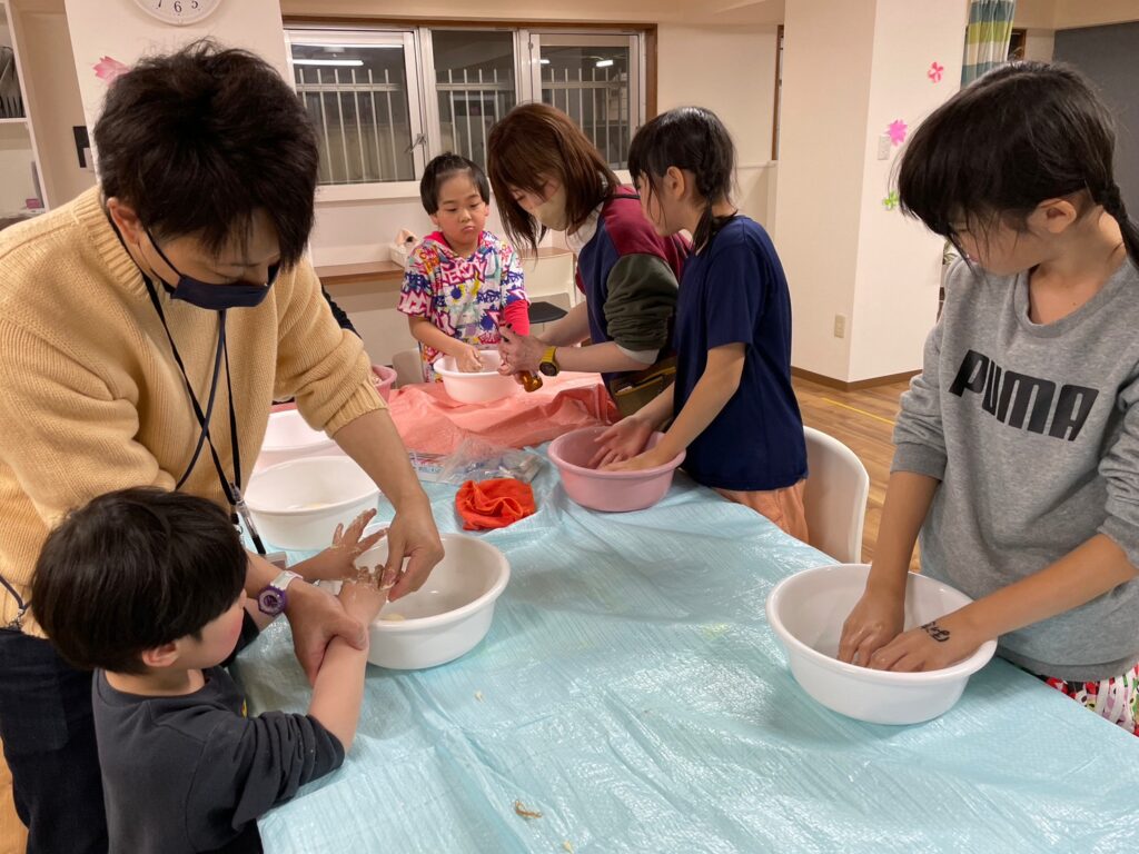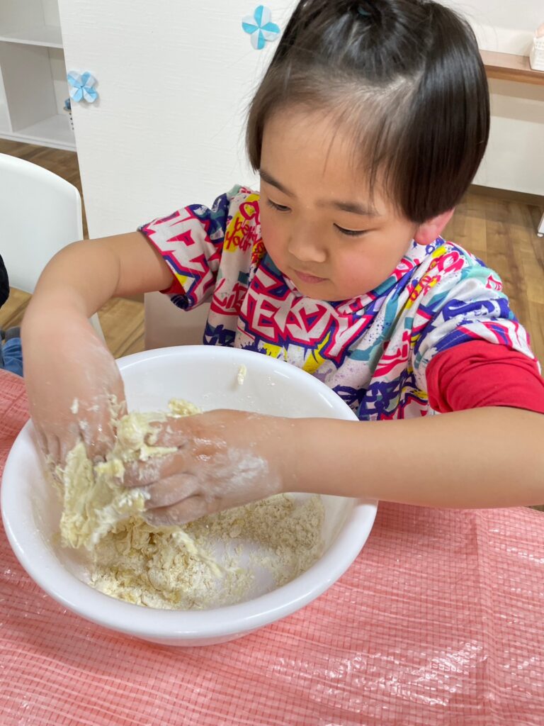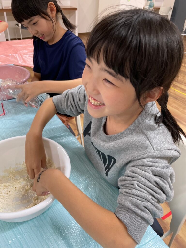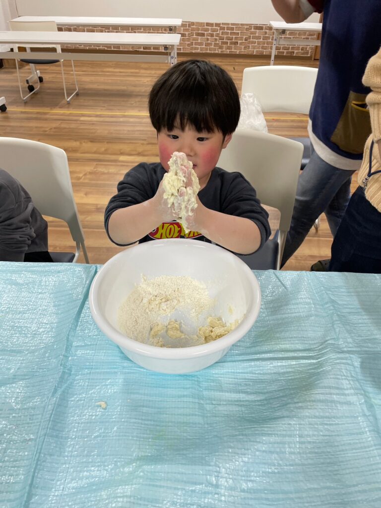 「パンみたい!」「この感じ苦手~」「なかなか固まらないよ~」「ドロドロしてて手にくっつくー」と色々な言葉が出てきました。