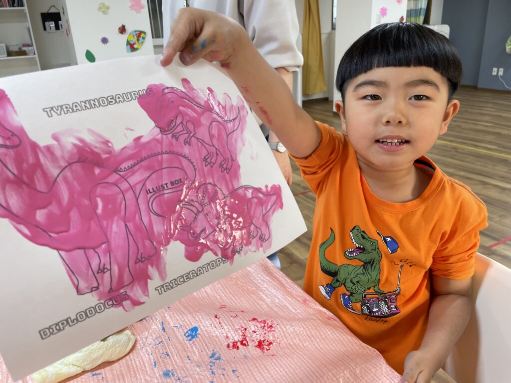 恐竜をピンク1色に染めたり、芸術的な作品も完成しました。