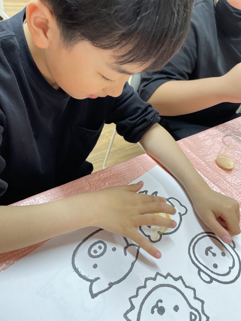 絵の具には、洗濯のりが混ざっているので、ドロッとした感触を楽しんでもらいました!