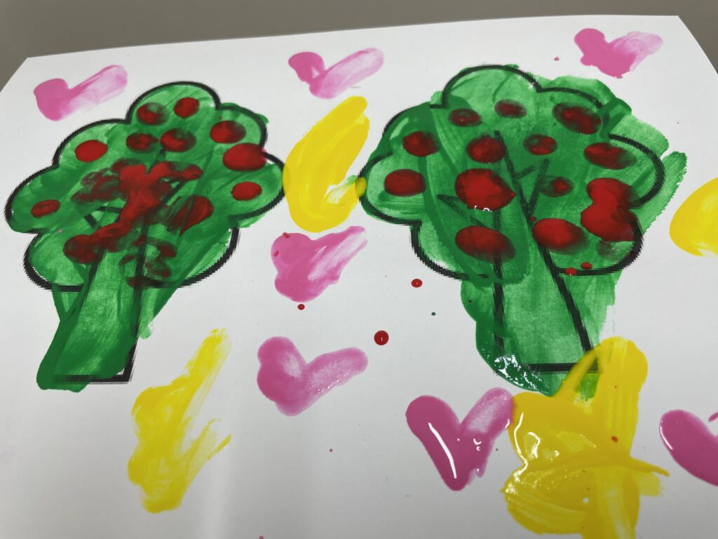 ハートに囲まれた果物の木の絵はとても可愛らしくできました🍎