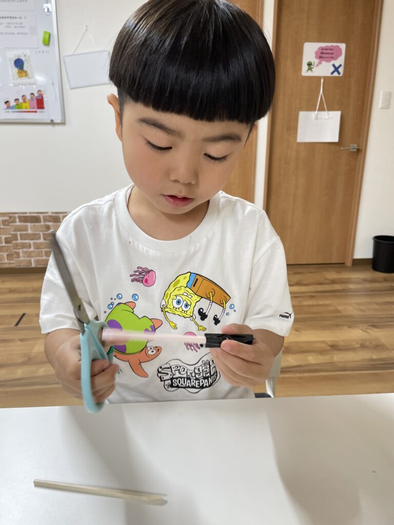 ・洗濯ばさみを紙に挟んだり、おはじきを移す課題や、チャックの開け閉め、短く切ったストローを掴む等、指先の感覚や力の入れ方をトレーニングしていきます。