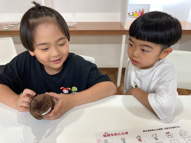 熊の人形を使って、人形を持っている人がお話をしていいことを、提示しています。