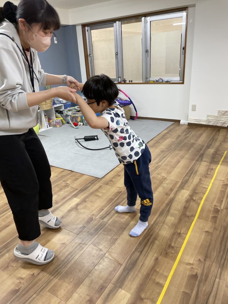 職員とマンツーマンでビジョントレーニングを行う子