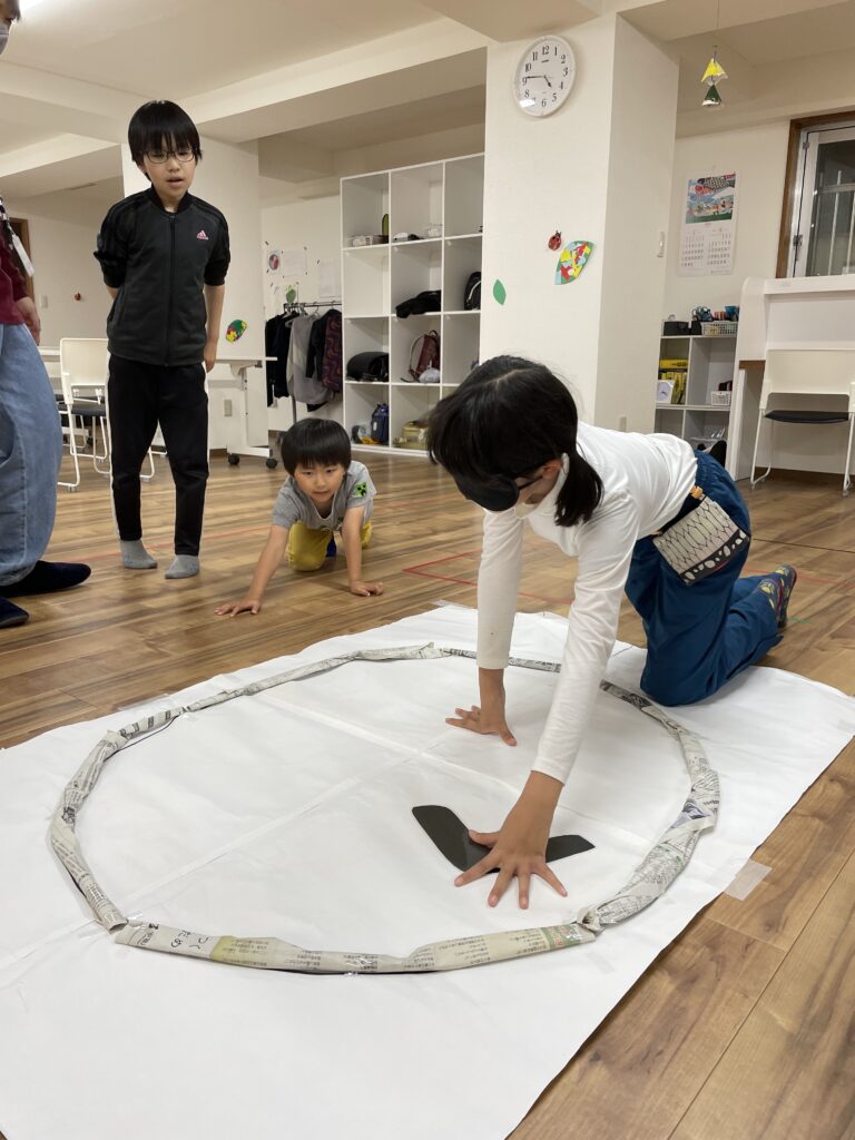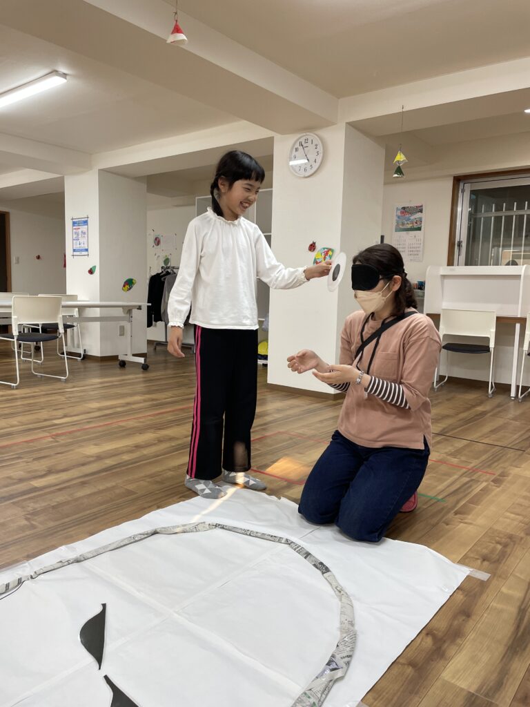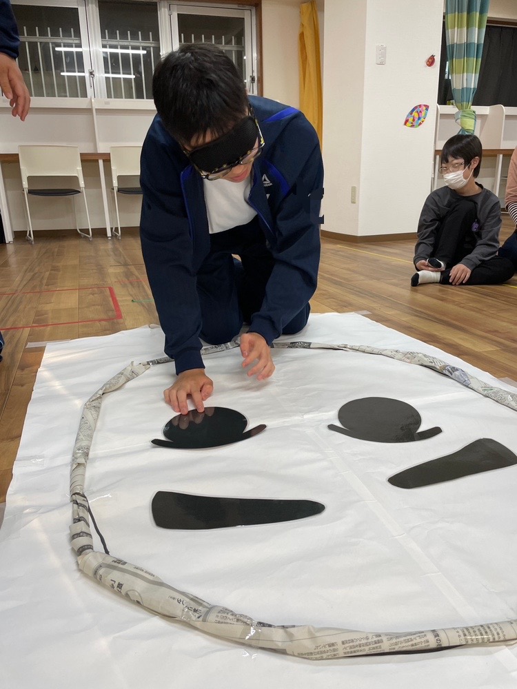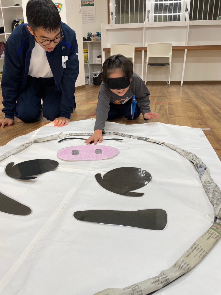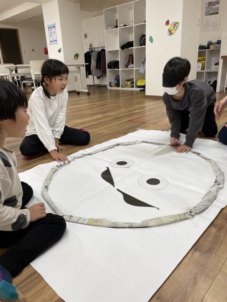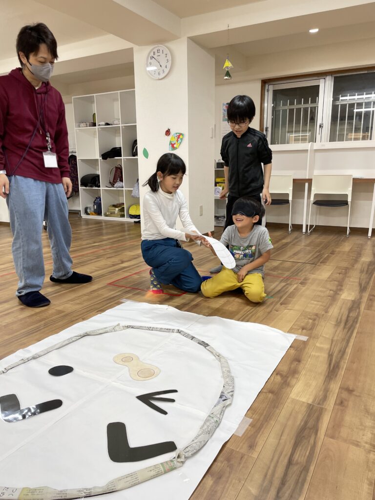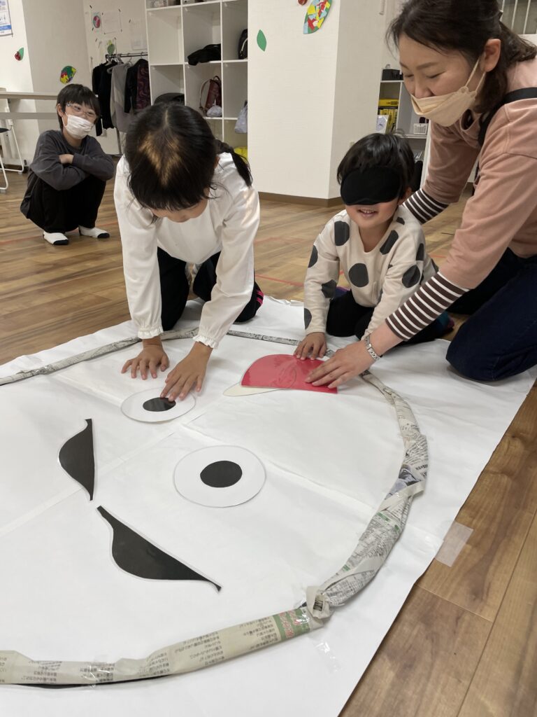 目隠しをした子どもは同じチームの子から指示をもらってそれぞれのパーツを置いていきます!