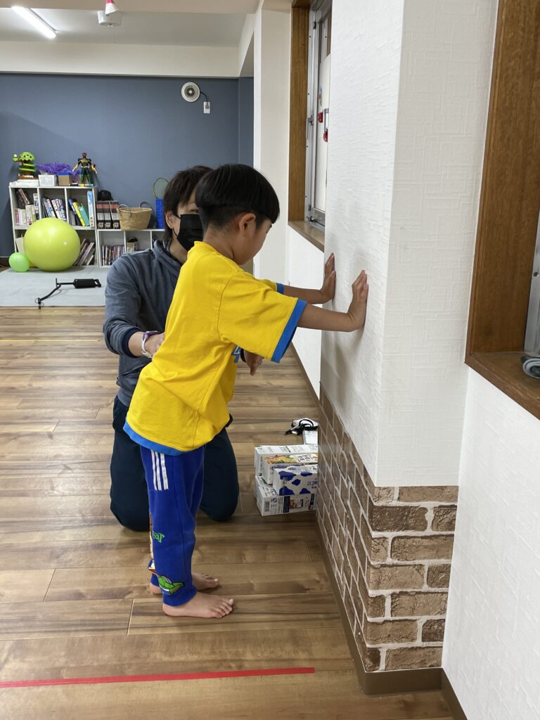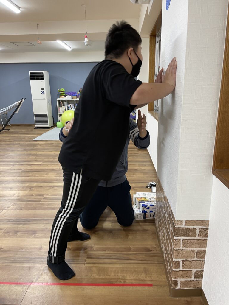 腕立て伏せの導入として、立ったまま壁を使って、肘の曲げ伸ばしを行い、感覚を身につけていきます。