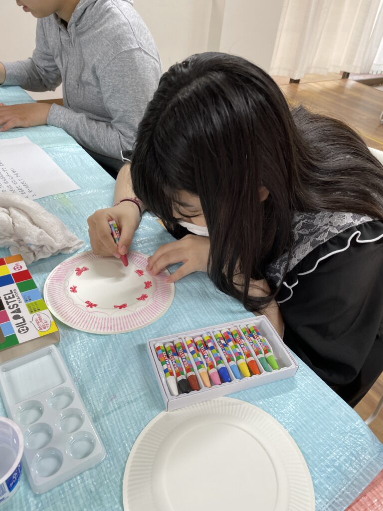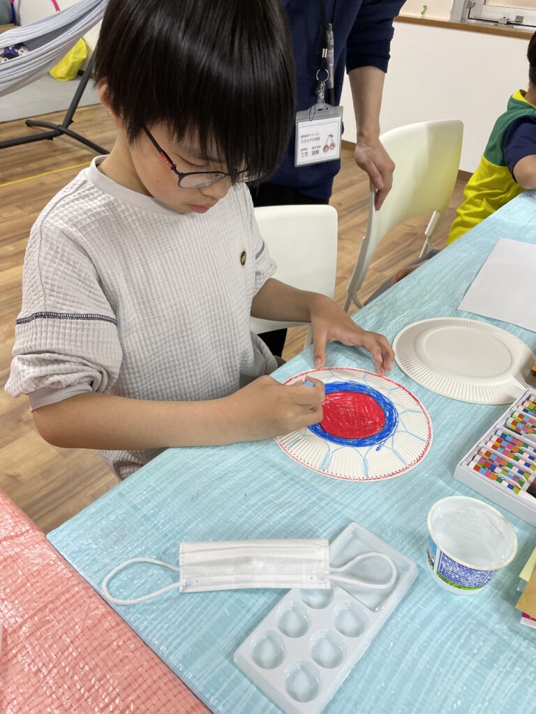 紙皿に、クレヨンやシール、絵の具で模様をつけていきました。