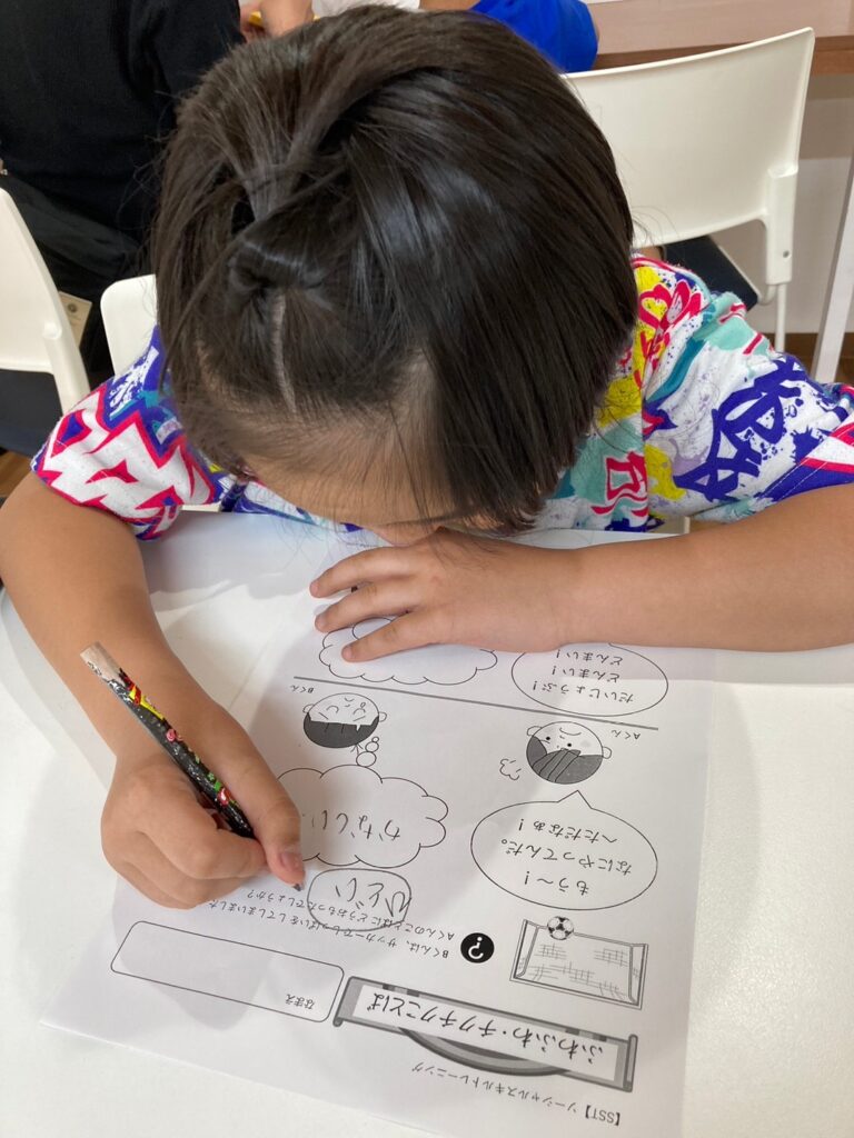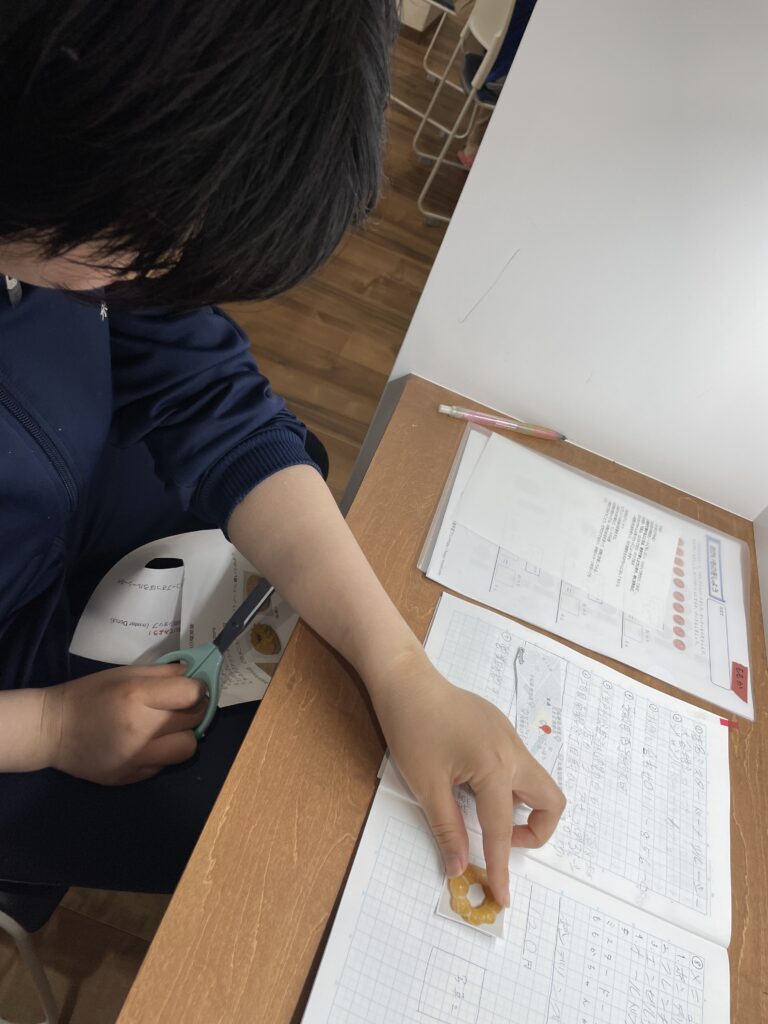この日はミスタードーナツをテーマに書き進め、自分の好きなドーナツは何円かを調べ、実際のお金をトレイに出せるかまでやっています👍