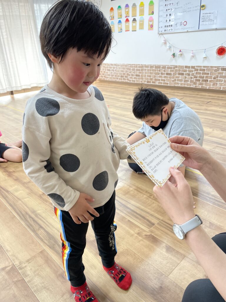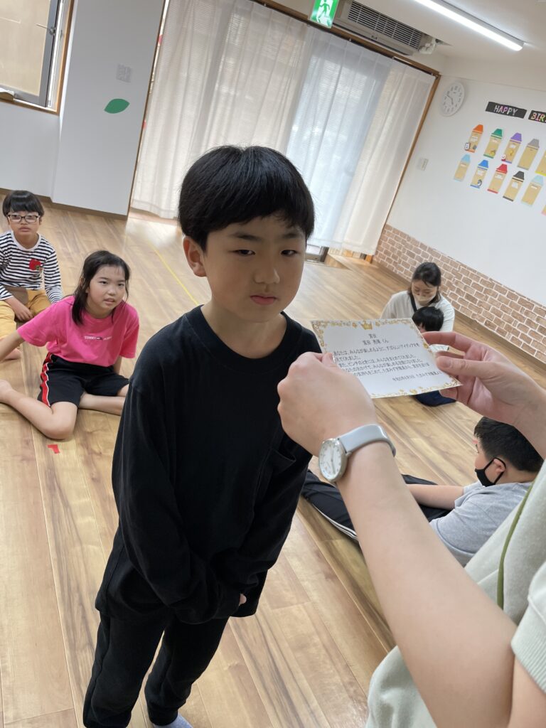 そして、最後には、今日の活動を考えてくれた動くチームの子ども達に、職員から感謝の気持ちを込めて賞状を渡しています!