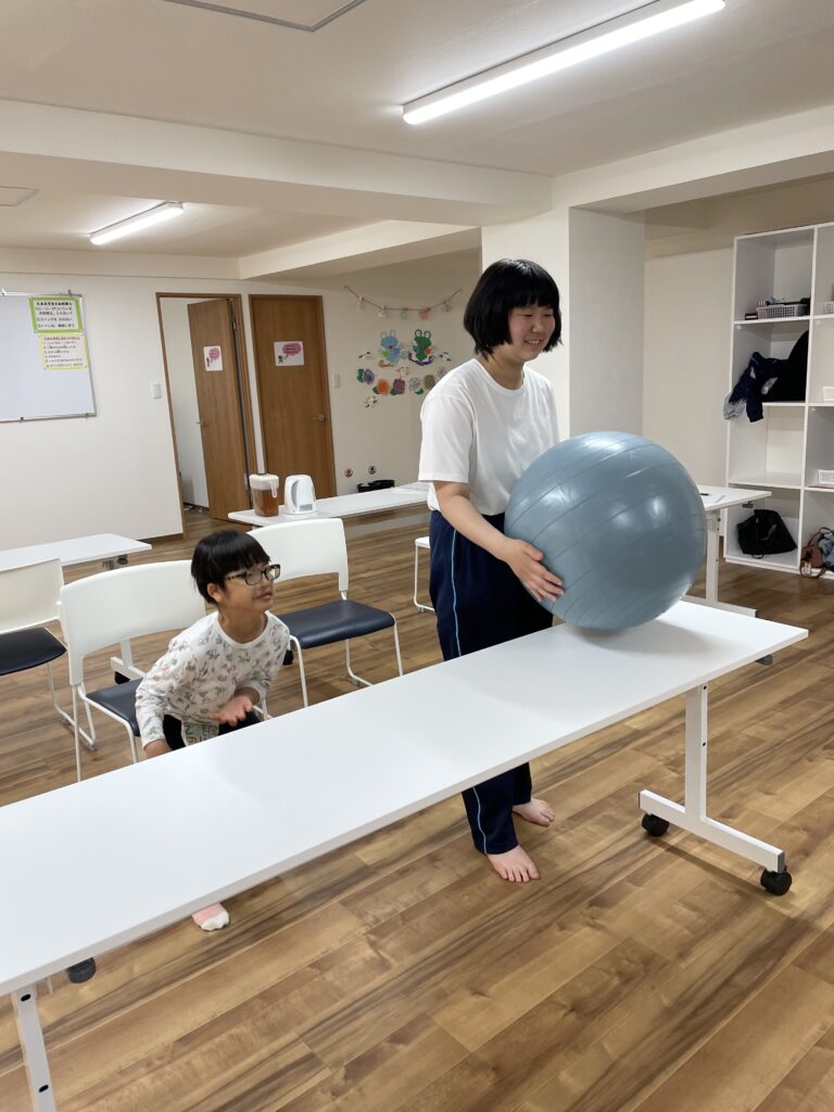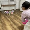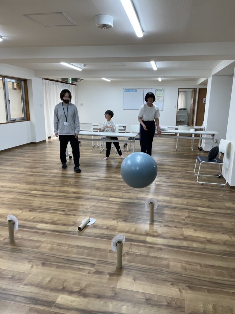 モンスターピンめがけてバランスボールを転がします。一見ボールが大きくてすぐに倒せそう!と思いますが、ボールが大きく弾んでしまい、モンスターピンを飛び越えていくことが多々ありました!