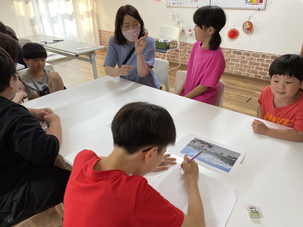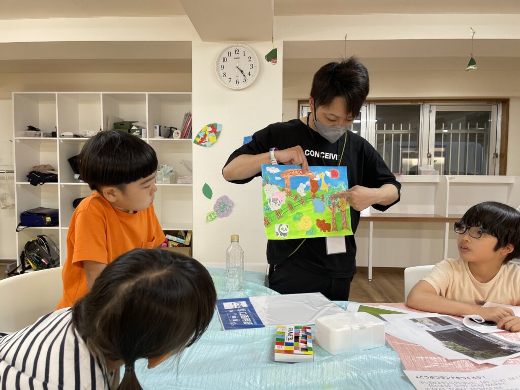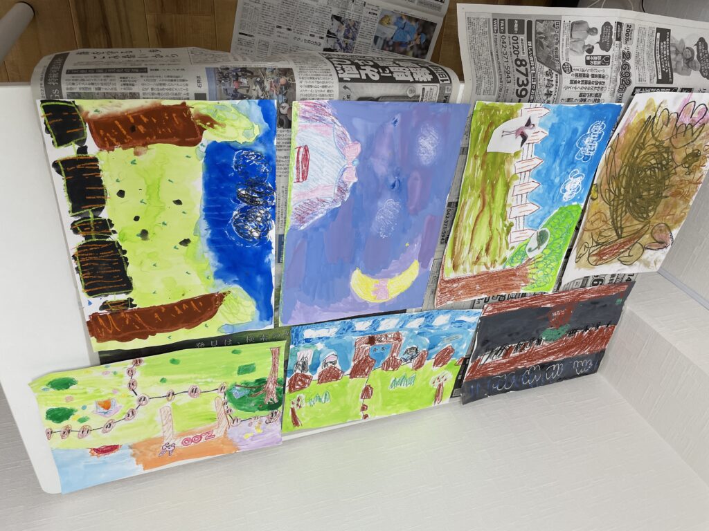 動物園のような絵を描く子や、草原が広がる大自然の絵を描く子など、思い思いの動物が住んでいる場所を描いていました。