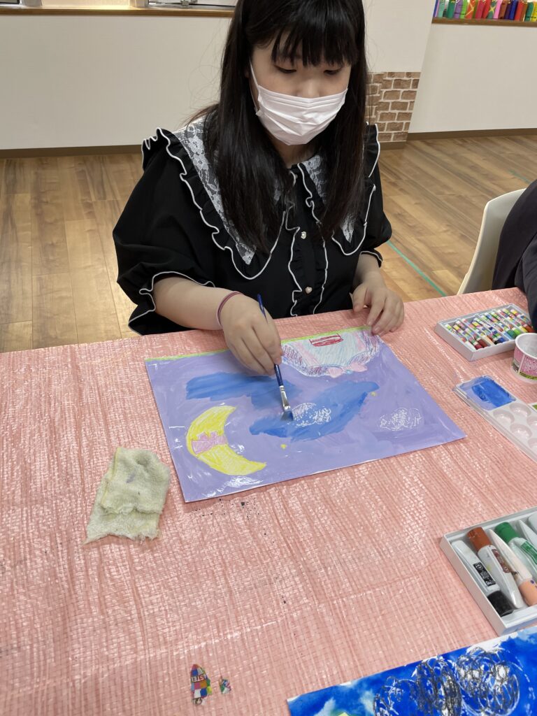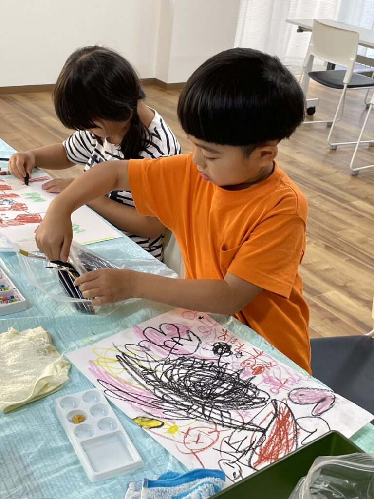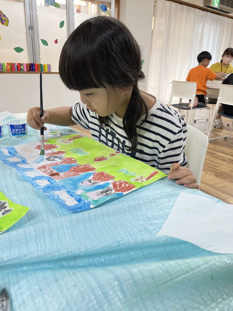 完成したら、その上から、空や草原など、大きい面積の部分を絵の具で塗って、はじき絵にしていきます🖌️