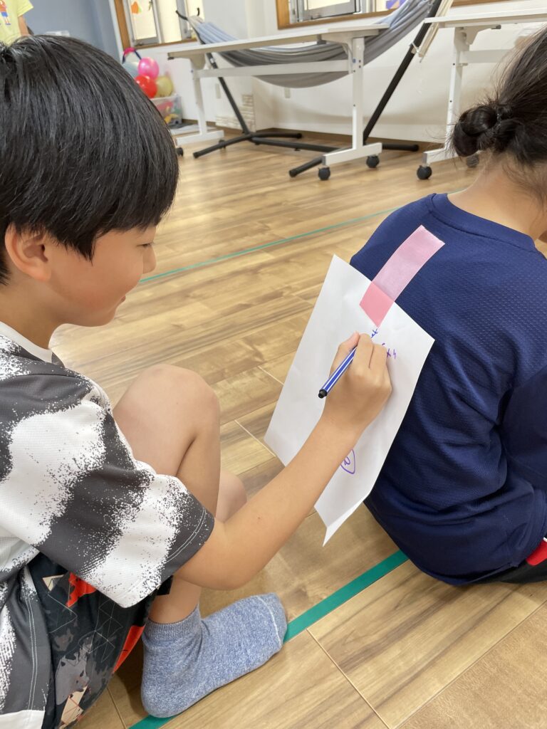 負けた人は、勝った人の背中に貼ってある紙に、その人の褒めるポイントを書いてもらいます。