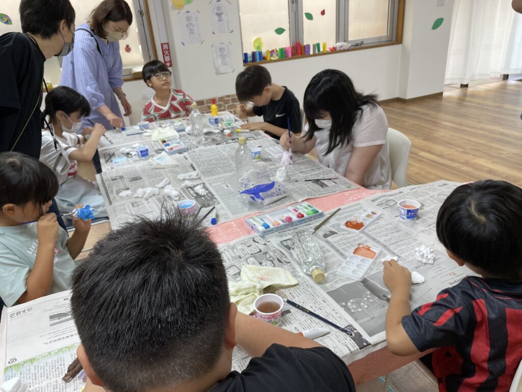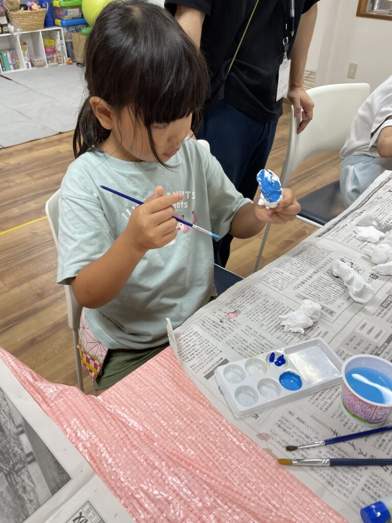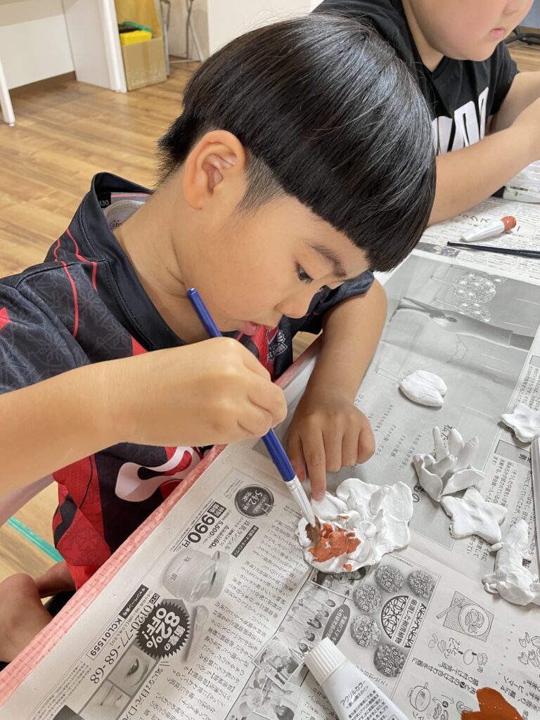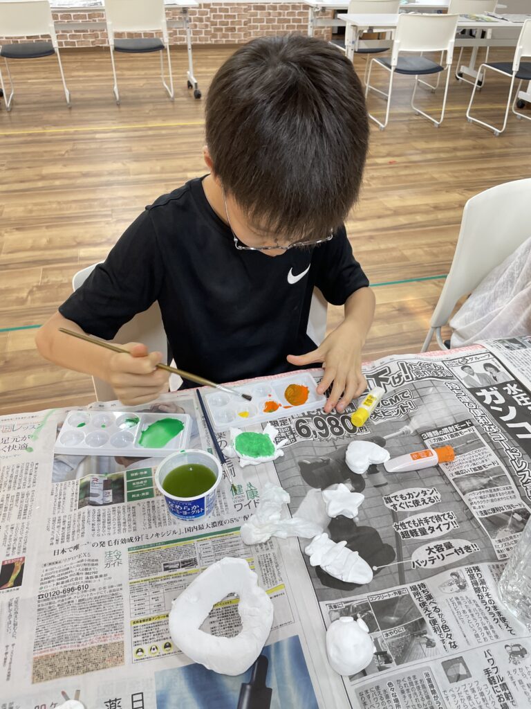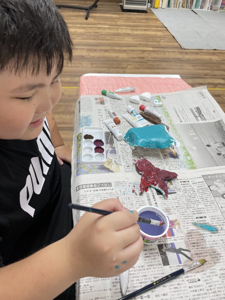 先週みんなが作った、カメ、イルカ、カニ、うなぎ、くらげ、カクレクマノミ、ヒトデ、クリオネ等々の紙粘土が乾いて固まったので、