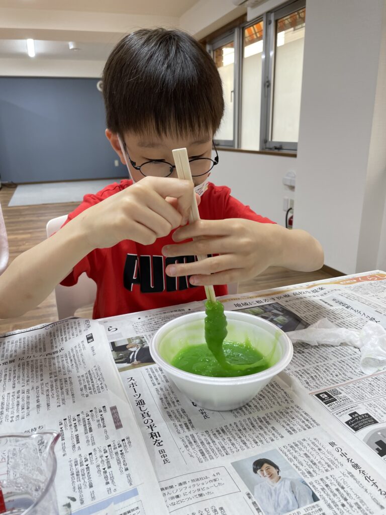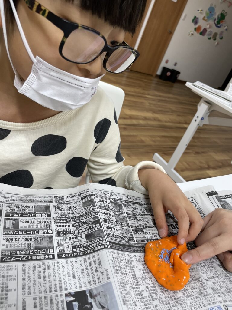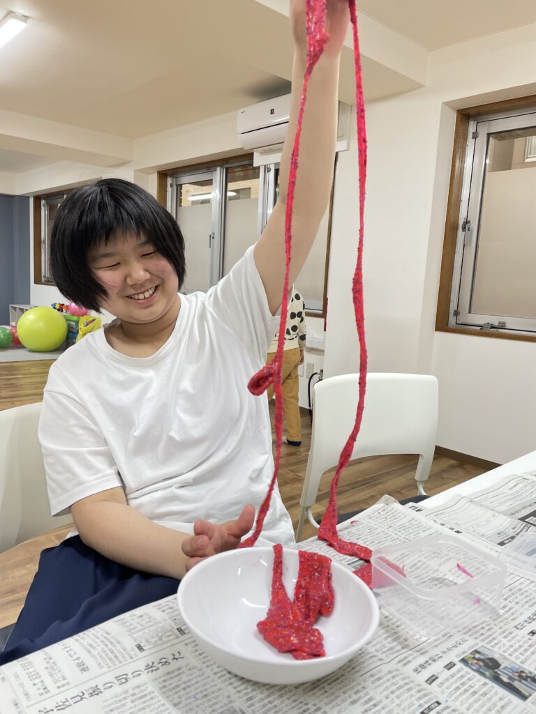 スライムも最初は触りたがらないお友達もいましたが、職員が触っているのを見たりして挑戦する気持ちになり、一度触れるとそのあとは自分で蛇をつくったり、おまんじゅうを作ったり存分にスライムを楽しみました♬