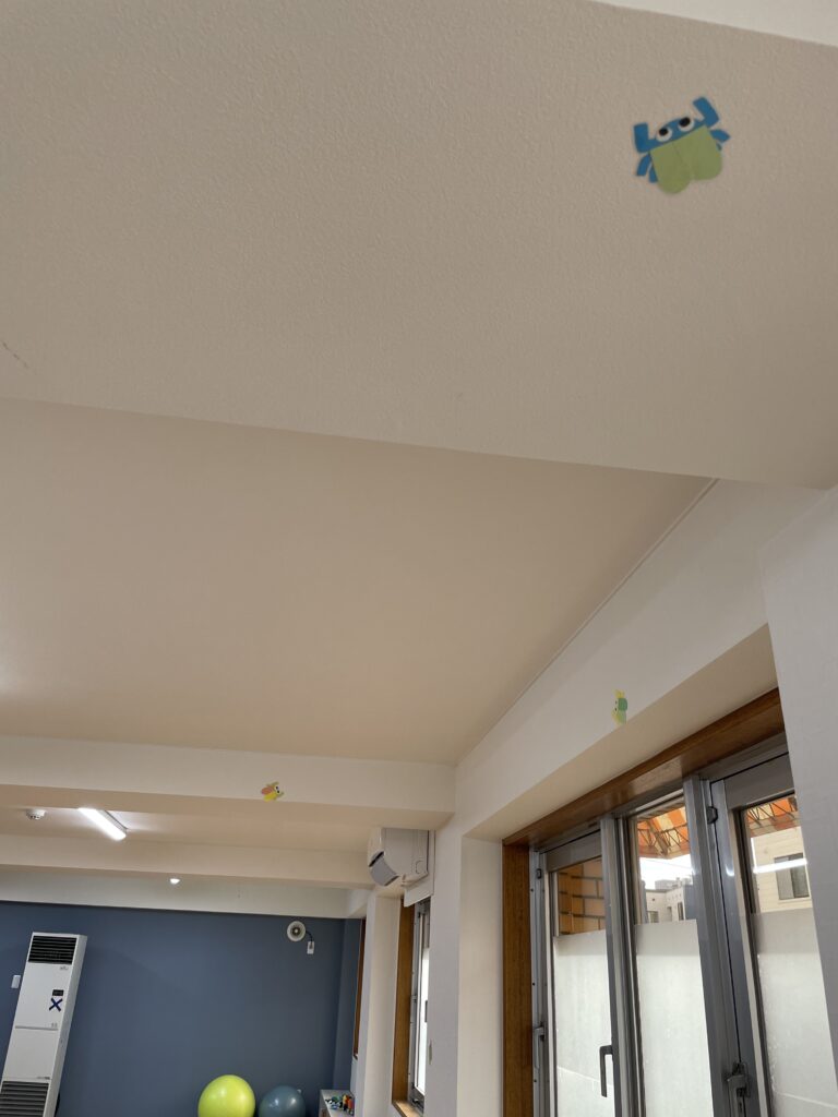 部屋中に貼ってあるハエ(画用紙)をたたいてくっつけるゲームです(^^)