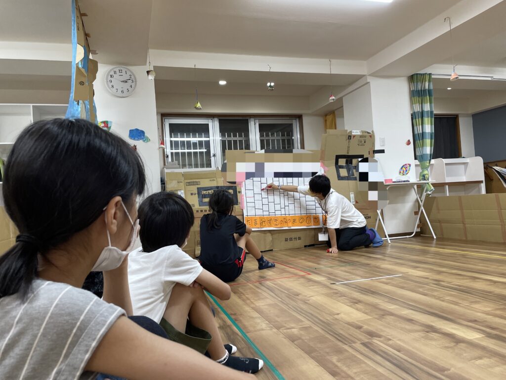 前回いなかった子はお友達から前回の大型工作のお話しを聞きながら、