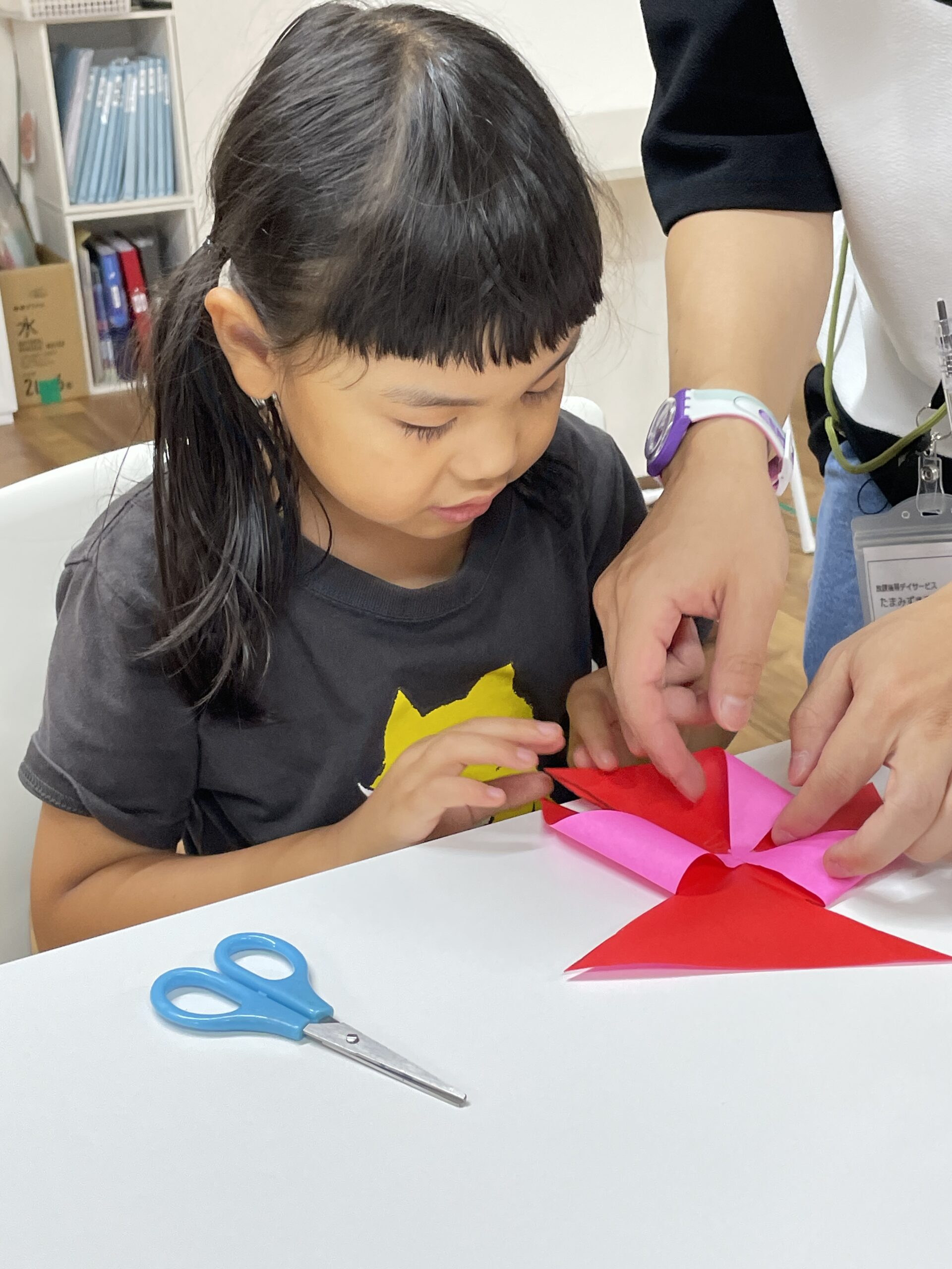 火曜日は制作活動、【折り紙かざぐるま】を作ります。