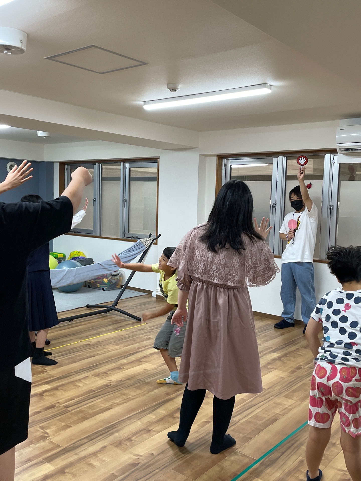 職員のじゃんけんを見て、すばやく反応し、自分の手を動かすという運動になります。