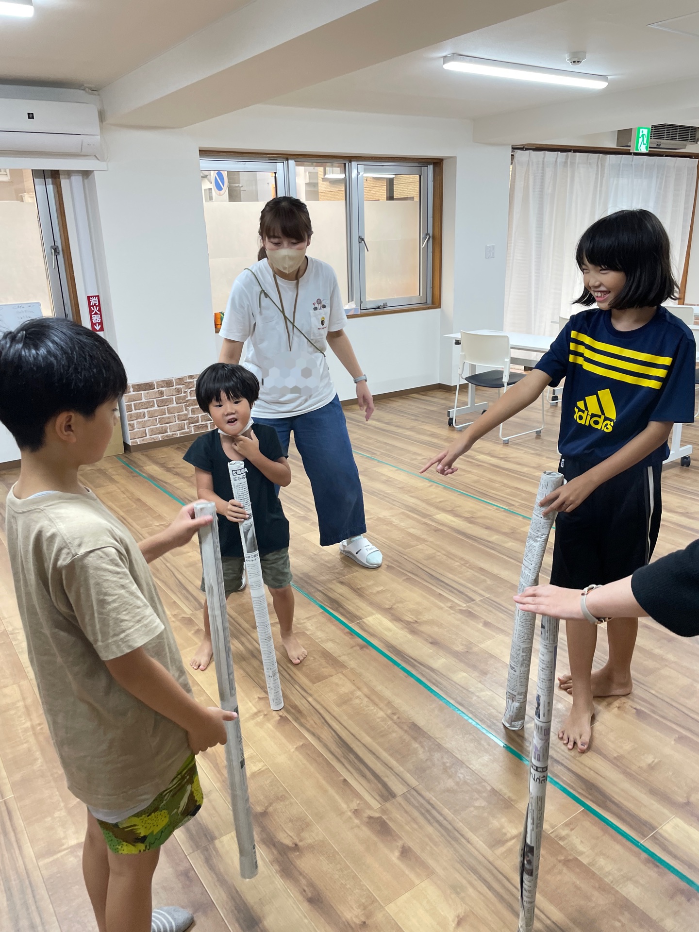 棒状に丸めた新聞紙を床に立て、「せーの」の声に合わせて手を離し、