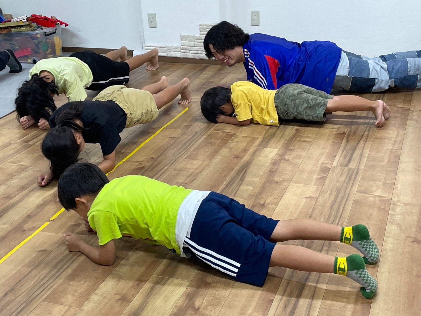 腹筋に力を入れて姿勢を保ちます。上手く体勢を保てる子は肩から足先まで真っすぐに。なかなか姿勢のとれない子は腰を上げて