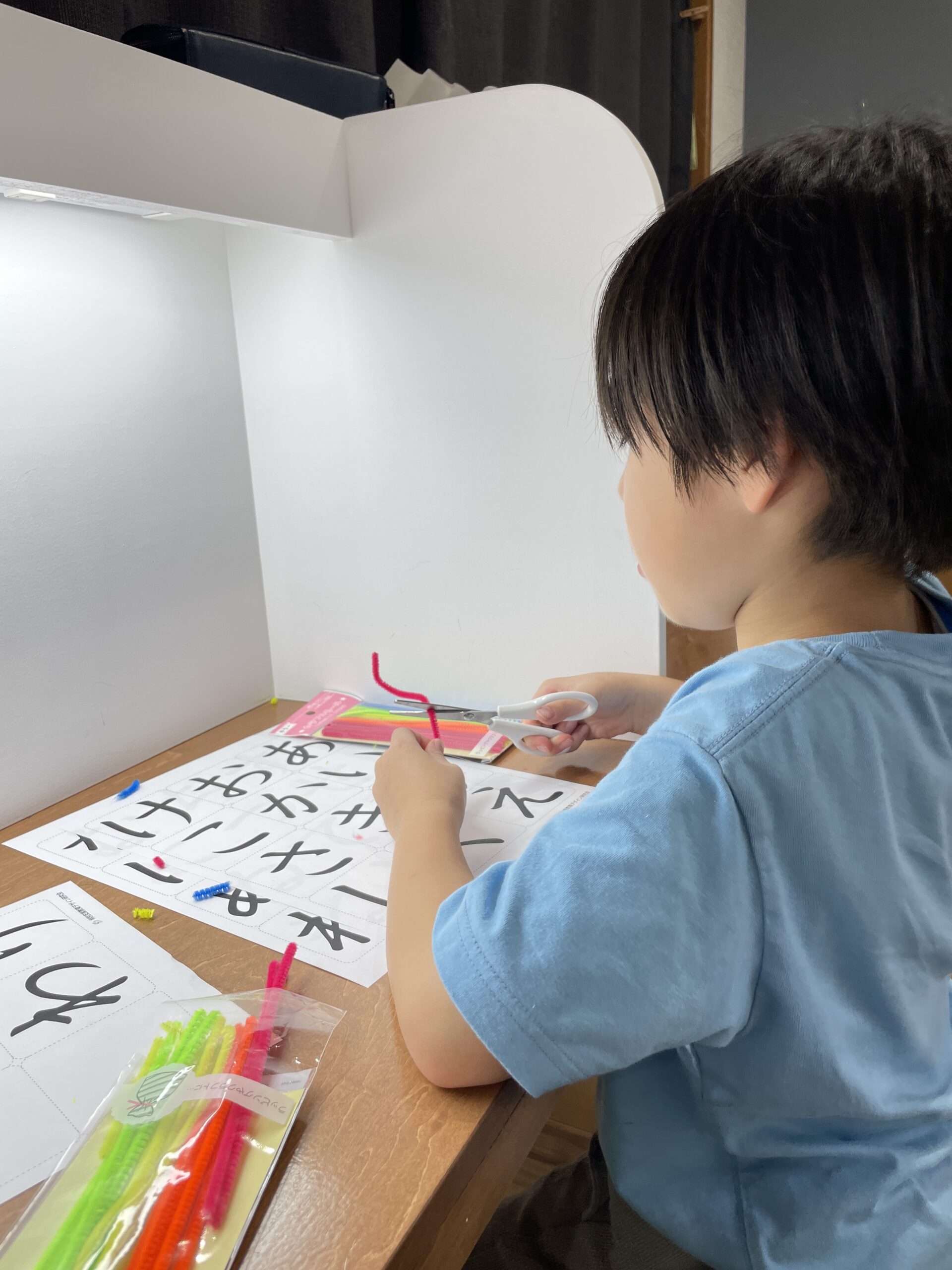 文字の形を正しく捉えるために立体的な文字に触れること。モールで立体化していきました。