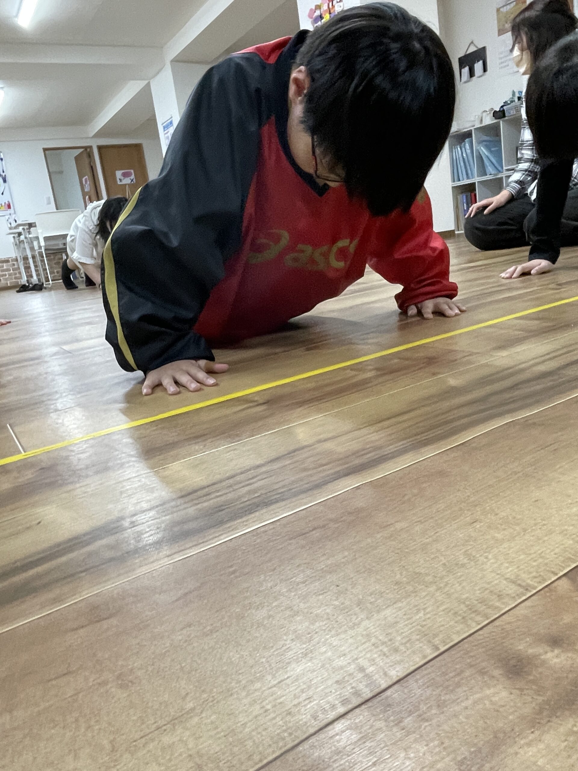 初めは可動域の小さい腕立て伏せをし、できる子は深くまで肘を曲げ、そこから腕を押し上げて伸ばしていきます。