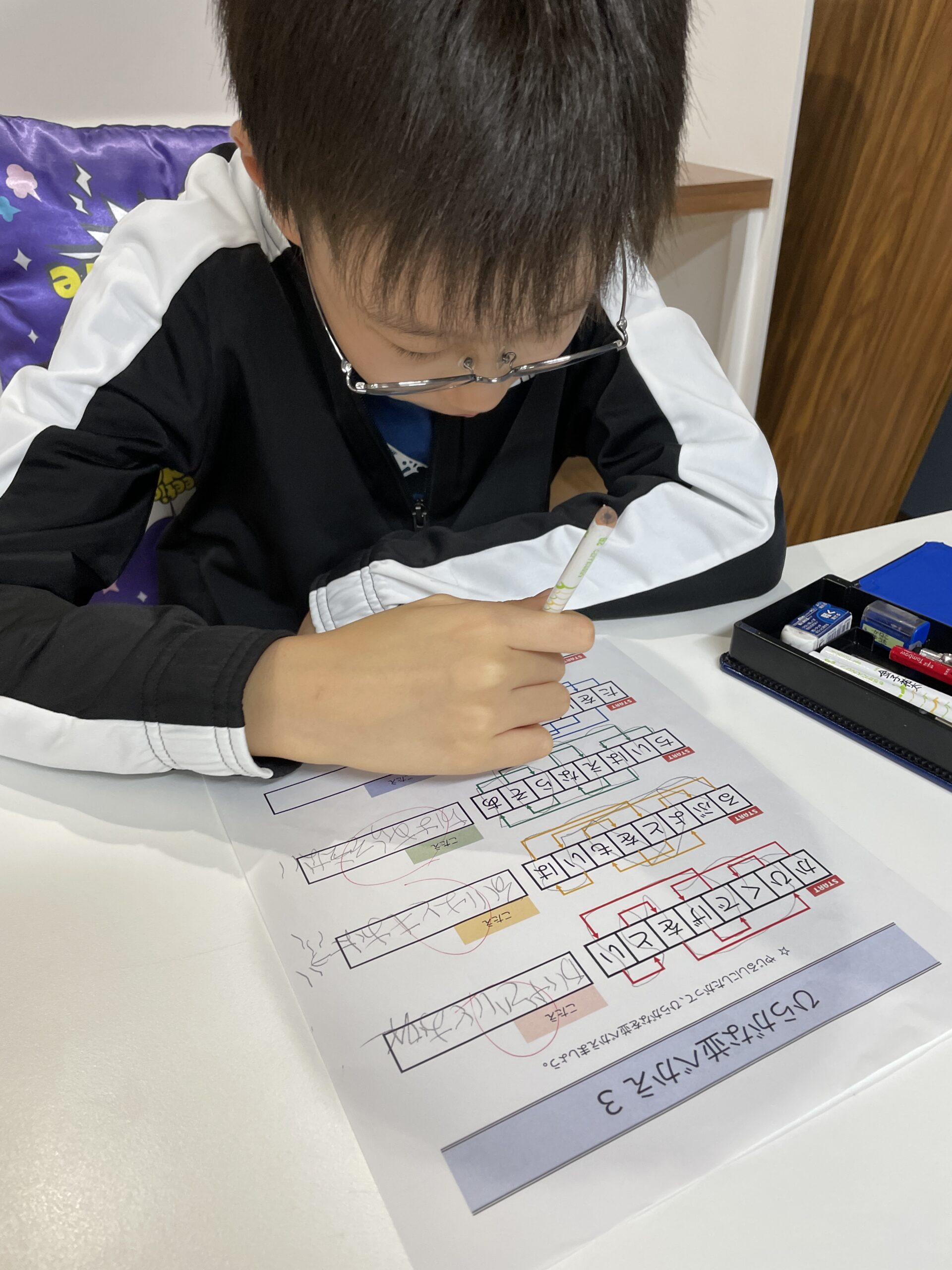 文字の並び替えなど、目の動きを使うビジョントレーニングを行う子、