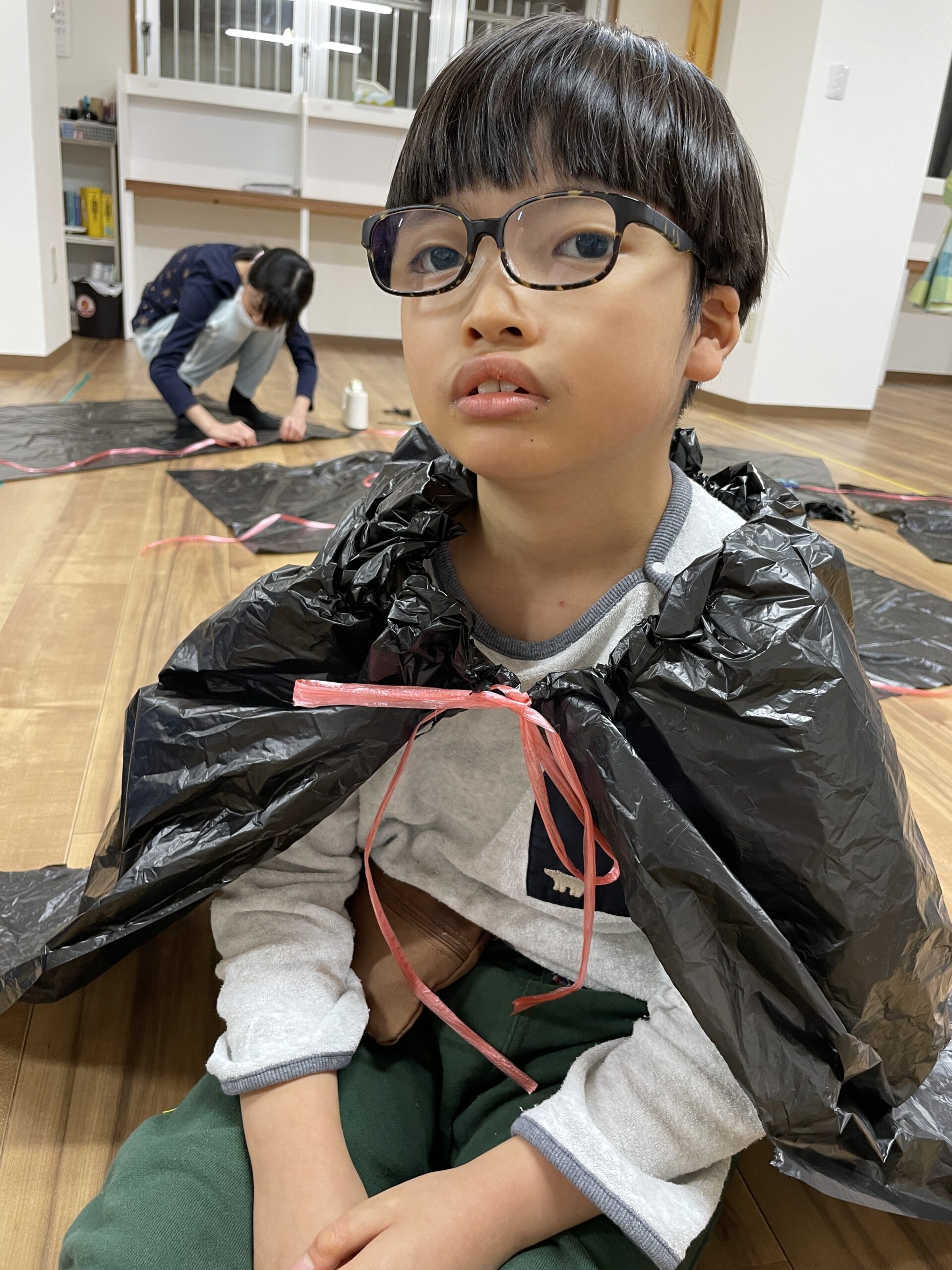 活動では、31日のハロウィン用の衣装となるマントとお面を作っていきました。