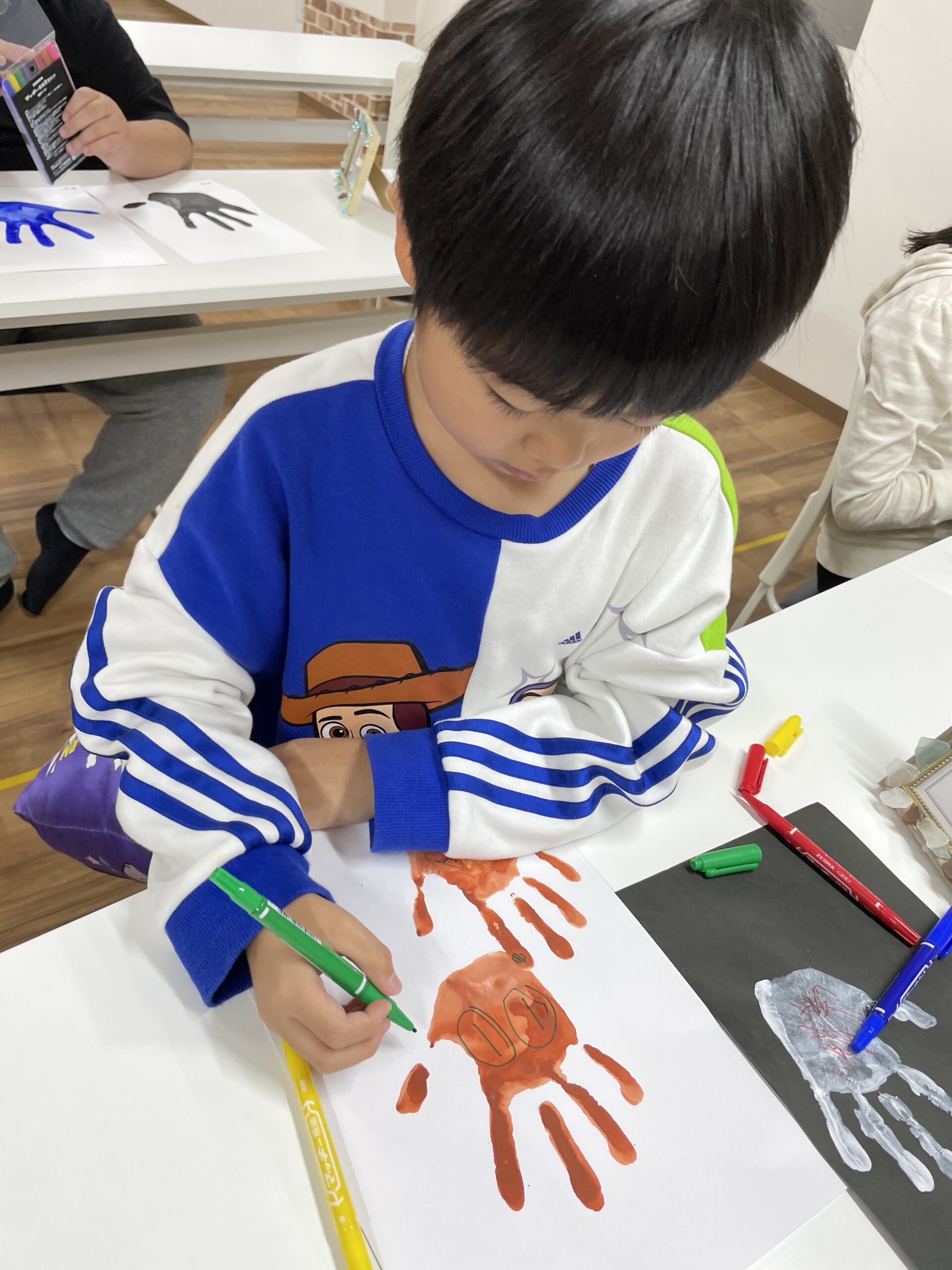 先週画用紙につけた手形が乾いたので、そこにお化けなどのハロウィンらしい模様などを描いていきます。