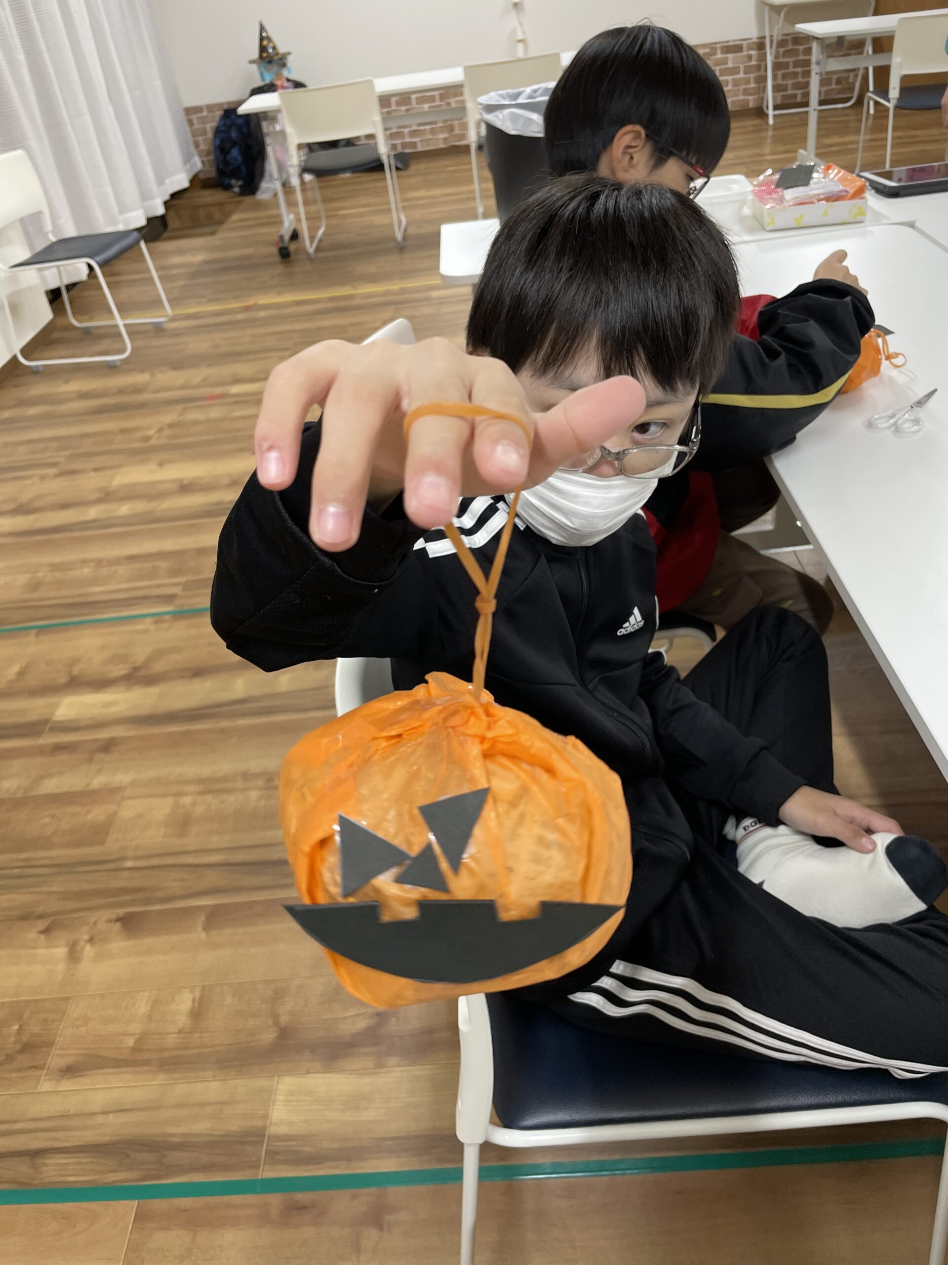 先週に引き続きビニール袋でハロウィンのマントを作るお友だちや、